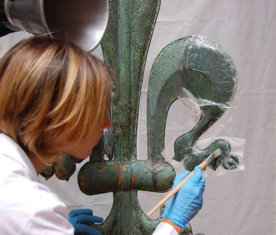 La pulitura ha previsto l’integrazione di tecniche differenziate a seconda delle caratteristiche specifiche del degrado di ogni singolo elemento. E’ stata definita mediante la messa a punto di tecniche di tipo chimico, meccanico e ablazione laser, calibrando i parametri di emissione in relazione agli strati di alterazione da rimuovere. Nella pulitura delle aree dorate è stato utilizzata la tecnica laser applicata sia in condizione di immersione localizzata che a secco. Per la rimozione delle vernici e dei vecchi protettivi a base di cera, sono state utilizzate miscele di solventi supportate da gel, coadiuvate dall’uso del bisturi e da spazzoline di setola animale. Insieme al restauro si è ritenuto necessario progettare un basamento di nuova concezione, adatto ad accogliere stabilmente la Banderuola nella sua nuova collocazione. Il nuovo basamento è stato realizzato con una struttura portante in metallo: nella porzione soprastante è stato realizzato un volume a forma di piramide tronca, che nella forma esemplifica e ripropone la foggia del manufatto originario (stessi angoli costruttivi, stessi angolari metallici di chiusura). La forma piramidale, che nell’originale è ricoperta di lastre di rame, è stata realizzata con tessitura di elementi in cotto, dorati in superficie sui lati a vista con foglia d’oro di colore ambrato. Questa scelta progettuale ha consentito indirettamente di richiamarsi alla situazione originaria della Banderuola: inizialmente infatti era totalmente dorata, doratura che però non ha potuto essere recuperata con il restauro del leone poiché ormai perduta. (edl)