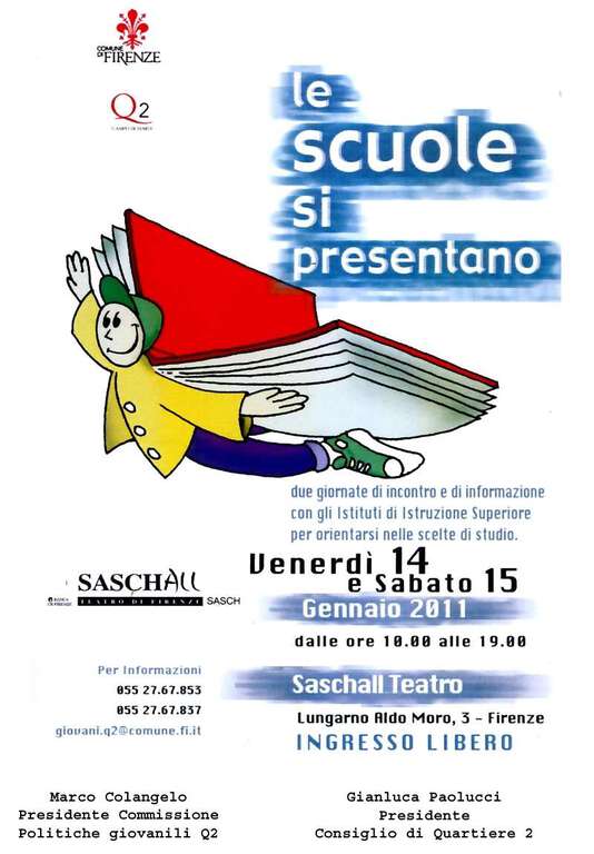 Ritorna “Le Scuole si presentano”. L’appuntamento con l’edizione numero quattordici della rassegna di orientamento scolastico è al Saschall di lungarno Moro, venerdì 14 e sabato 15 gennaio dalle 10 alle 19, ingresso libero. Organizzata dal Quartiere 2 in collaborazione con l’assessorato comunale all’Istruzione, l’iniziativa offre due giornate di incontro e informazione tra gli istituti scolastici, i ragazzi della scuola dell’obbligo e le loro famiglie, per fare chiarezza tra le numerose offerte formative e orientarsi nelle scelte di studio future. Saranno presenti 46 scuole superiori fiorentine e del suo comprensorio, dai licei agli istituti tecnici e professionali fino agli istituti alberghieri e al conservatorio Cherubini. Ciascuna scuola si presenta in uno stand dove insegnanti e operatori qualificati forniranno alle famiglie e ai ragazzi materiale informativo sulle attività dell’istituto e progetti e convenzioni con altri istituti europei. Il successo de “Le scuole si presentano”, che conta ogni anno circa 6000 presenze, è originato dalla crescente differenziazione e complessità dell’offerta formativa che ha portato dei cambiamenti nella scuola e una forte domanda di informazione da parte delle famiglie. Da segnalare la partecipazione dei centri di formazione professionale del Comune e del Servizio di Orientamento della Provincia che svolgono un importante ruolo contro la dispersione scolastica e per migliorare la qualificazione professionale. L’accoglienza del pubblico è affidata ai ragazzi degli istituti ad indirizzo turistico/alberghiero Saffi e Buontalenti che, guidati dei loro insegnanti, organizzeranno dei buffet per i visitatori. All’interno della manifestazione ci sarà un incontro di approfondimento di alcuni temi con la tavola rotonda “Quale scuola per il futuro?” venerdì 14 gennaio alle 10 presso la saletta incontri del Saschall a cui prenderanno parte Rosa Maria Di Giorgi, assessore all’educazione del Comune di Firenze e i dirigenti scolastici Masimo Batoni, Giancarlo Fegatelli, Paolo Collini, Lucia Anna Calogero, Elisabetta Bonalumi. Introdurranno Gianluca Paolucci e Marco Colangelo, rispettivamente presidente del Quartiere 2 e presidente della commissione politiche giovanili. Info, 055 2767837/7853. (lb)