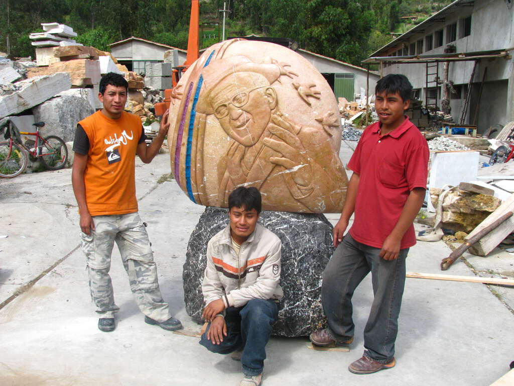 L’opera, alta 110 cm e larga 130 cm con una profondità di 50 cm, è stata realizzata da Fredy Cerna, Walter Salas, Rusvel Pena, tre scultori della scuola degli artigiani “Don Bosco” di Jangas, in Perù. La scuola voluta da Padre Ugo De Censi è situata sulle Ande, a oltre tremila metri d’altitudine, ed è seguita dai volontari dell’Operazione Mato Grosso, un movimento di volontariato educativo missionario che svolge un insieme di attività in America Latina (in particolare in Perù, Ecuador, Brasile e Bolivia), volte a educare e favorire i più bisognosi.