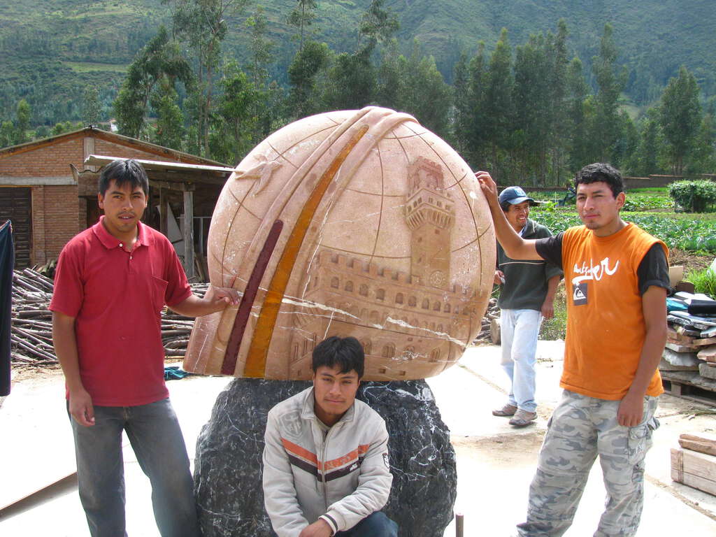 La scultura, in un particolare marmo rosso peruviano, il rosso Huancayo, ha una forma sferica e riproduce da un lato il sindaco Santo e dall’altro Palazzo Vecchio. Su entrambi i lati ci sono delle rondini, come segno di concordia e pace che dovrebbero regnare tra i popoli, e un arcobaleno in vetro colorato, prodotto nella vetreria peruviana di Chacas, che simboleggia la vita e il colore da dare alla quotidianità.