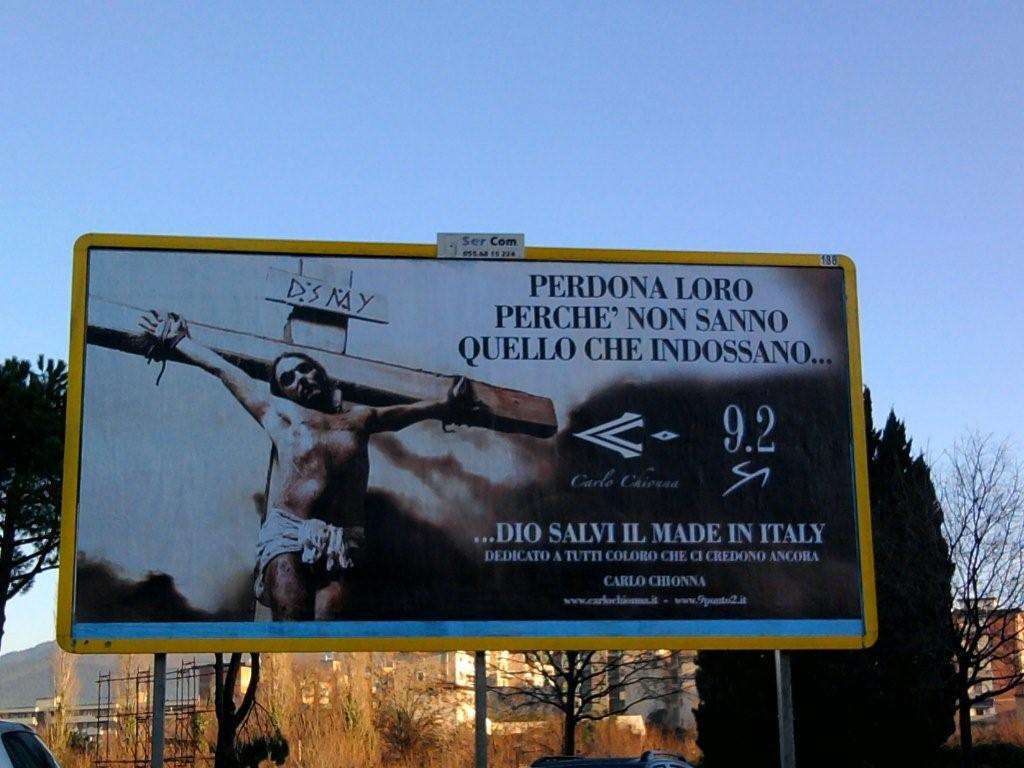 "Il cartellone pubblicitario della casa di moda Carlo Chionna sito in Viale Guidoni ed in altre zone di Firenze va immediatamente rimosso in quanto offensivo per tutti i cattolici e non solo" E’ quanto sostiene Giovanni Fittante (Idv)."E' legittima la libera attività imprenditoriale ma credo – continua Fittante – che ci sia un limite a tutto. Particolarmente offensiva, infatti, è la scritta sulla croce D.S.M.Y (Dio salvi il Made in Italy) al posto di I.N.R.J. Per cui mi rivolgo al Sindaco – conclude Fittante – affinchè intervenga con urgenza per far rimuovere tali pubblicità per rispetto di tutti i cittadini cattolici che si sentono offesi da tali immagini. A tal proposito presenterò un apposita mkozione affinchè in futuro non si ripropongano campagne pubblicitarie offensive nei confronti di qualsiasi religione, istituzione o dignità della persona". (lb)