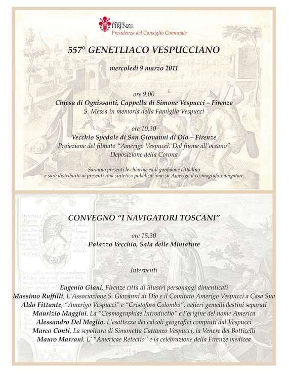 “Un plauso va innanzitutto al ‘Comitato Amerigo Vespucci a casa sua’ – ha dichiarato il presidente Giani presentando le iniziative – per la continuità con cui ha lavorato in vista delle celebrazioni vespucciane del 2012. Celebrazioni che vedranno Firenze centro delle iniziative, anche grazie a una clausola inserita nell’accordo Bondi-Renzi per la valorizzazione dei beni culturali della nostra città”.