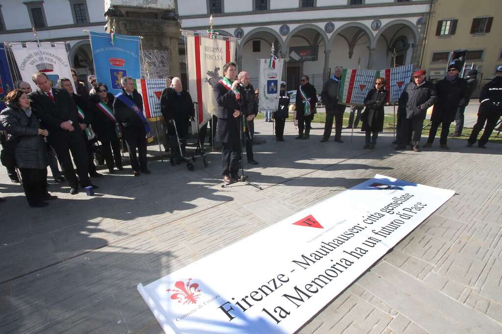 I Gonfaloni hanno aperto la celebrazione che ha visto presenti, tra gli altri, il sindaco Matteo Renzi, il primo cittadino della città austriaca di Mauthausen Thomas Punkenhofer, l’assessore all’educazione Rosa Maria Di Giorgi, la consigliera regionale Daniela Lastri, l’assessore provinciale alla pubblica istruzione Giovanni Di Fede, la presidente della commissione pace Susanna Agostini, Alessio Ducci, presidente dell’Aned (l’Associazione nazionale ex deportati) di Firenze e Marcello Martini (il più giovane deportato italiano ma che non faceva parte di quel gruppo partito da Firenze).