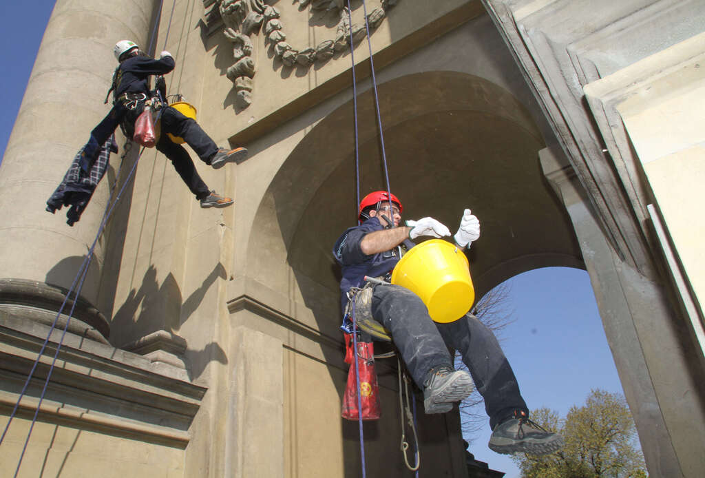 Sono iniziati gli interventi di manutenzione dell’arco dei Lorena in piazza della Libertà. E stamani, dopo la predisposizione del cantiere avvenuta ieri, sono entrati in azione anche i "tecnici-alpinisti" della ditta specializzata Flyservice Group. Si tratta di operai che lavorano “appesi” come appunto gli alpinisti con tanto di imbracatura e corda doppia.