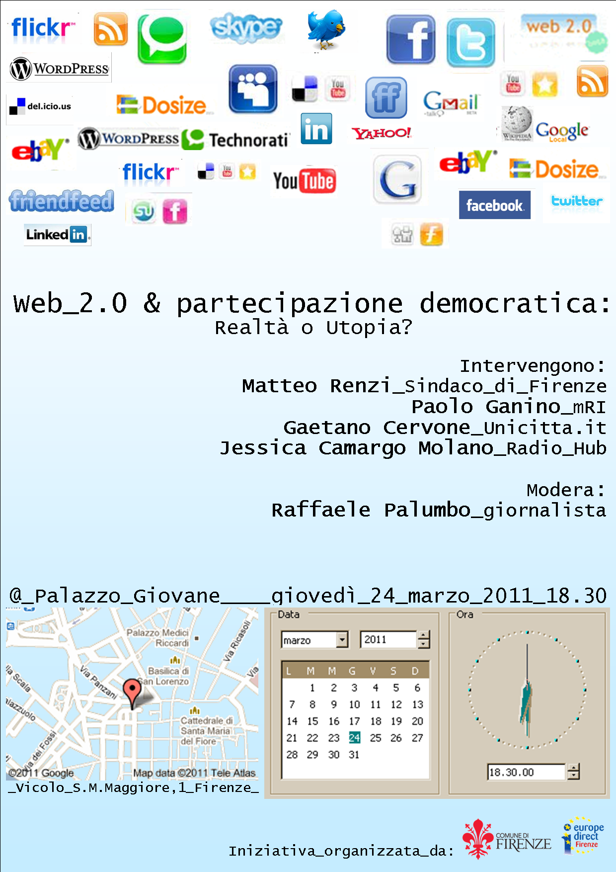 Domani il primo appuntamento, 'Web 2.0 & partecipazione democratica: realtà o utopia?', al quale parteciperanno il sindaco Matteo Renzi, Paolo Ganino (Meridiani Relazioni Internazionali), Gaetano Cervone (Unicittà.it), Jessica Camargo Molano (Radio Hub). Modera il giornalista Raffaele Palumbo.