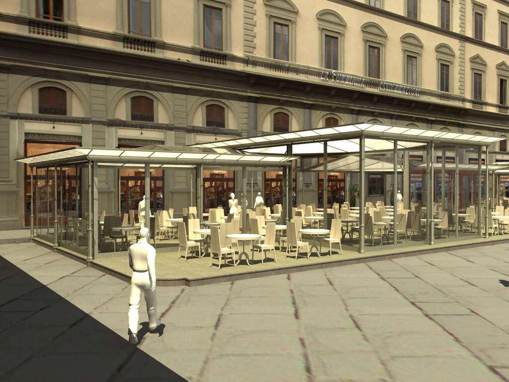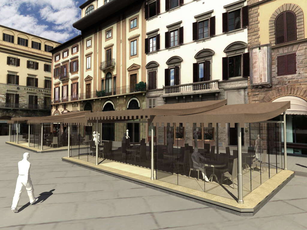 Si differenziano nei seguenti punti: il progetto che riguarda i dehors in piazza della Signoria prevede una leggera copertura con tendaggi color ruggine mentre quello per i dehors in piazza della Repubblica indica una copertura in vetro trattato e la presenza di colonne in ghisa per richiamare quelle già presenti nella piazza in stile ottocentesco.