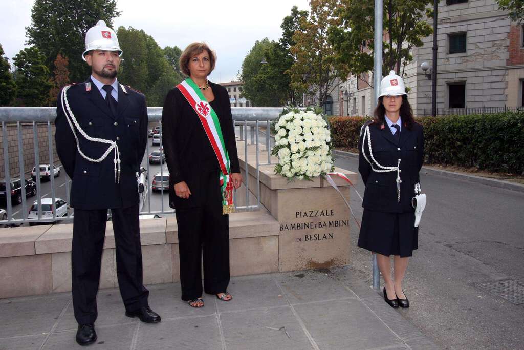 Un cuscino di fiori nel piazzale intitolato alle ‘Bambine e ai bambini di Beslan’, alla Fortezza da Basso, per commemorare la strage, avvenuta esattamente cinque anni fa in una scuola della città del Caucaso russo, nella quale persero la vita 334 persone, tra le quali 186 bambini.