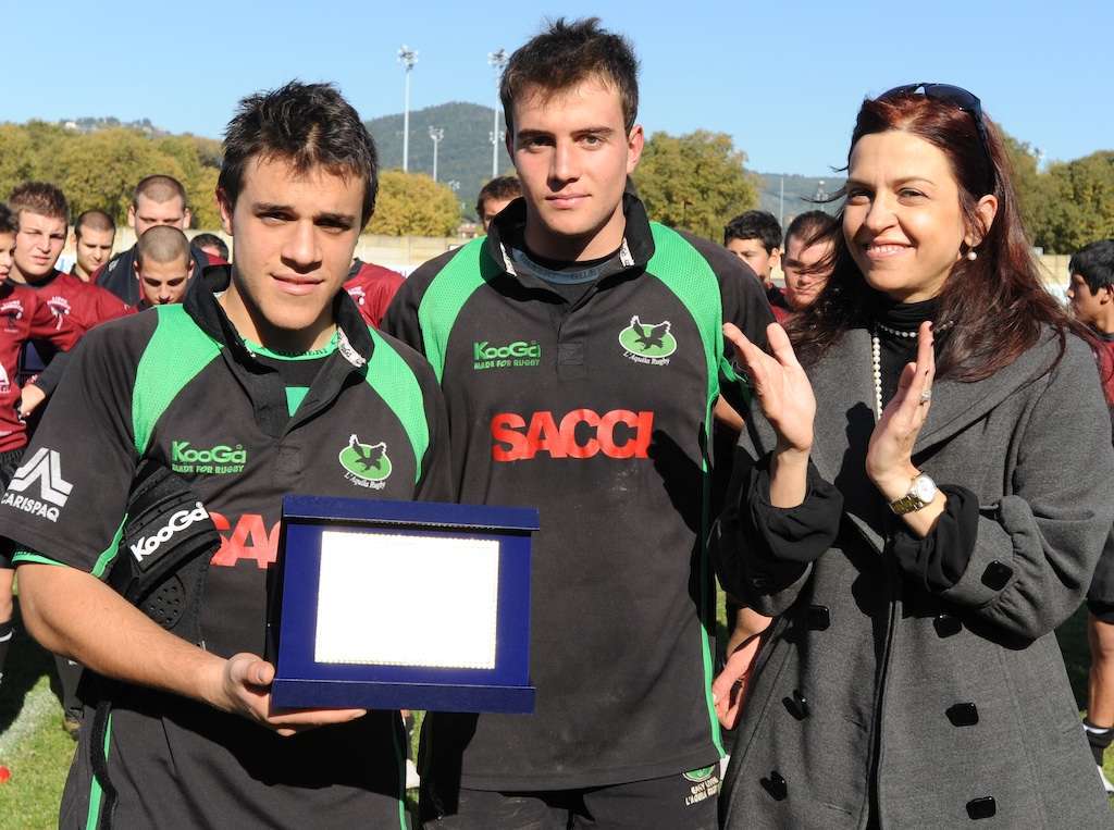 In campo il portiere viola Sebastien Frey ha offerto al capitano della squadra abruzzese, la maglia della Fiorentina intitolata alla memoria del giocatore Lorenzo Sebastiani, il giovane pilone dell’Aquila Rugby 1936 scomparso la tragica notte del 6 aprile.(fd)