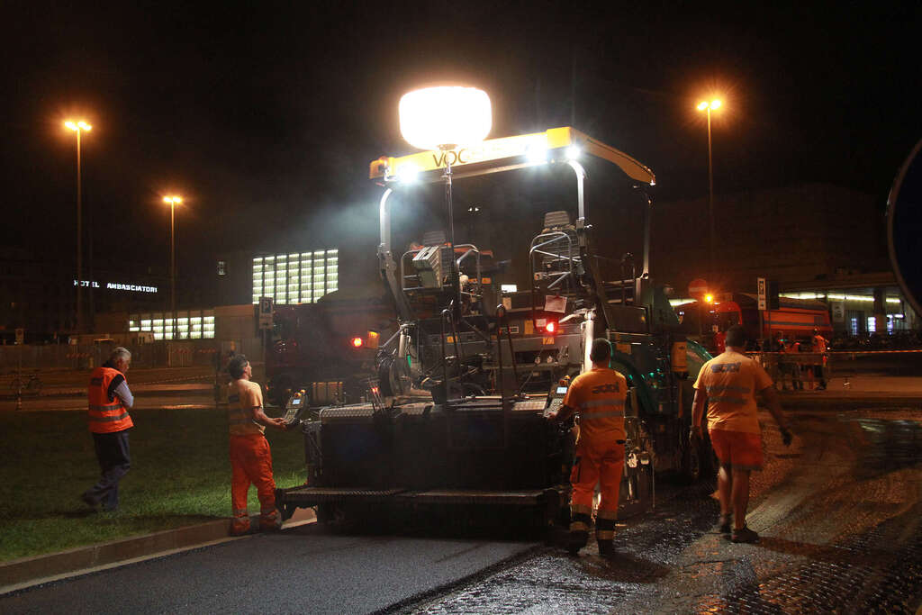 Ruspe, camion e bitumatrici al lavoro dall'ora di cena all'alba, da ieri sera fino a venerdì, per riasfaltare l'area intorno alla stazione di Santa Maria Novella. Si tratta di una serie di interventi nell'ambito del pacchetto complessivo di cantieri stradali relativi ai Mondiali di ciclismo che si svolgeranno a fine mese, costano 300 mila euro e interessano un'area di 10 mila metri quadrati: la rotonda della stazione, largo Alinari, piazza Adua e via Valfonda.