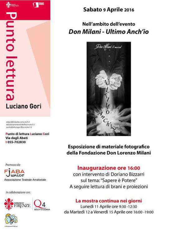Dal 9 al 15 aprile, inoltre, sarà allestita una mostra fotografica su don Lorenzo Milani presso il punto lettura Luciani Gori, nel viale dei Pini all’Isolotto. Organizzata dalla Fondazione don Milani e dal quartiere 4 la mostra è in collaborazione con l’Associazione Lib(e)ramente Pollicino che gestisce il punto lettura.