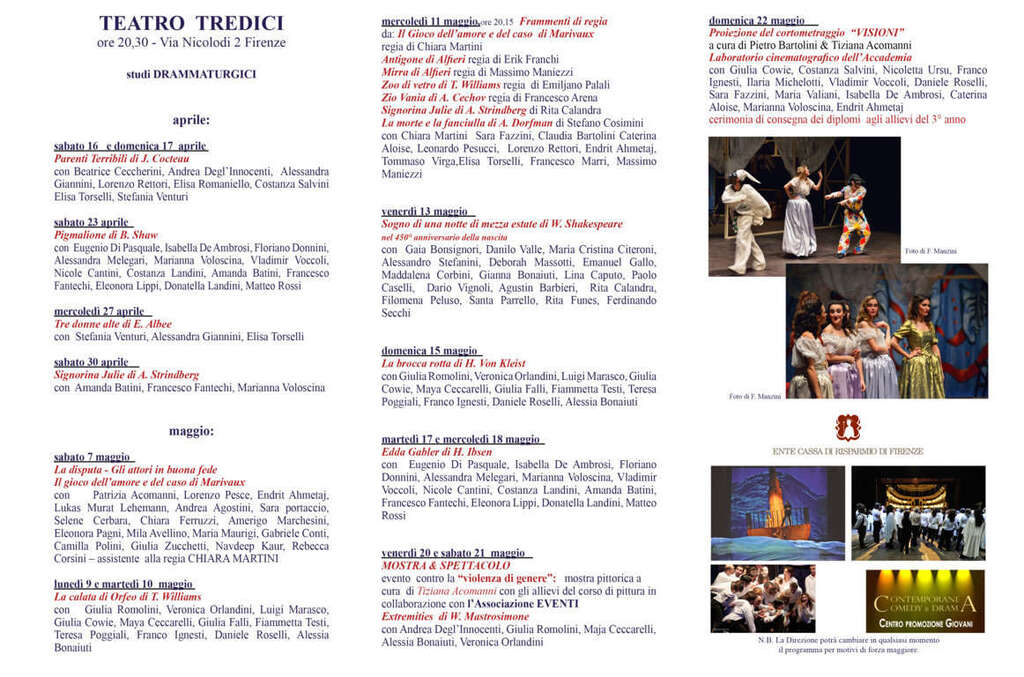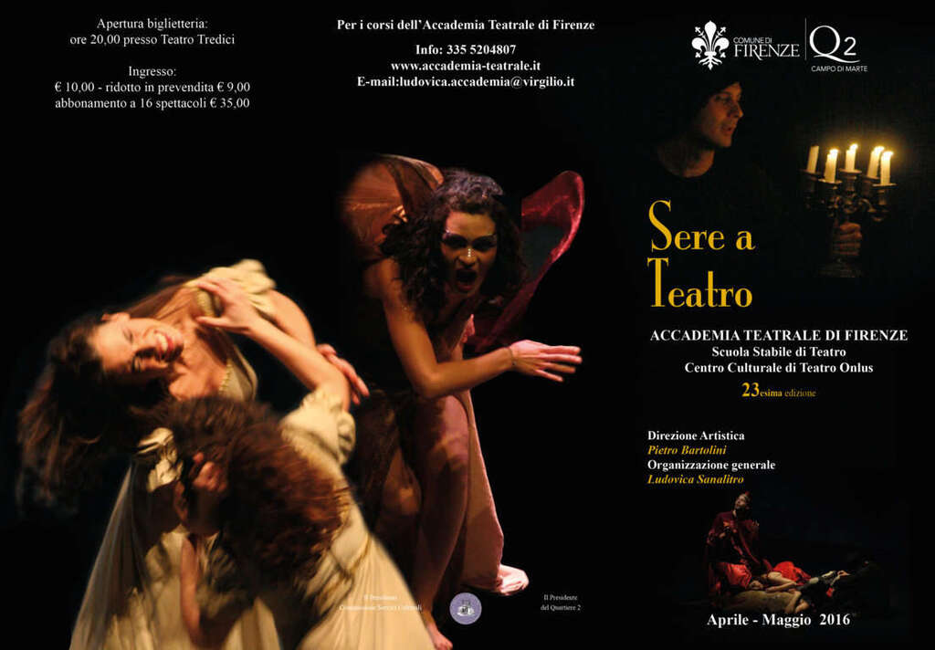 Sabato 16 aprile con lo spettacolo I Parenti Terribili di Cocteau prende il via la 23° edizione di “Sere a Teatro” Rassegna Teatrale di primavera con 16 spettacoli organizzata dall’Accademia Teatrale di Firenze con la Direzione di Pietro Bartolini e il Quartiere 2 del Comune di Firenze. Gli spettacoli saranno rappresentati nel teatro decò Teatro Tredici in Via Nicolodi, 2 (Zona Campo di Marte). “Torna anche quest’anno Sere a Teatro, la rassegna – spiega la presidente della Commissione cultura e sport del Comune di Firenze Maria Federica Giuliani – dell’Accademia Teatrale di Firenze diretta da Pietro Bartolini. Un appuntamento con tanti giovani e grandi talenti”.