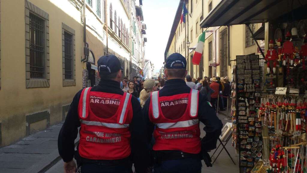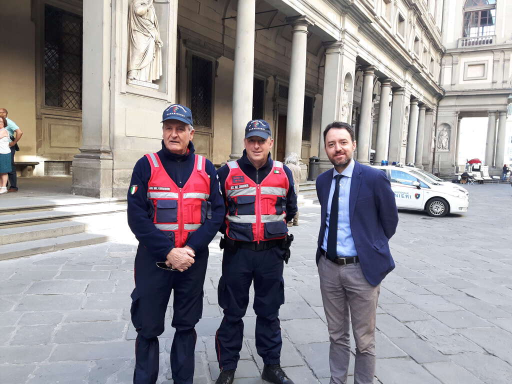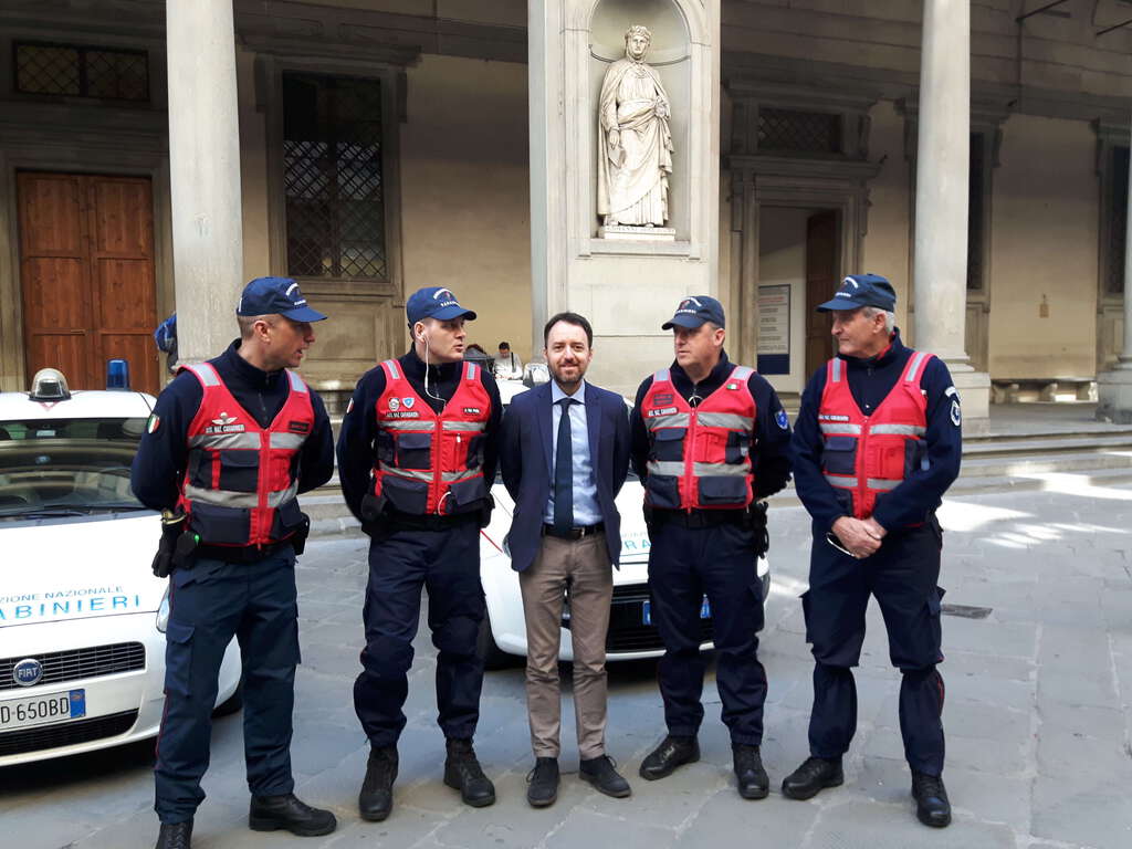 È iniziato oggi il servizio dei volontari dell’Associazione nazionale Carabinieri. Per adesso sono due le postazioni in cui le squadre saranno presenti tre giorni la settimana dalle 10 alle 18 no stop, ovvero il piazzale degli Uffizi e l’area di via Ricasoli. Questa mattina l’assessore alla sicurezza urbana e Polizia Municipale Federico Gianassi è andato a salutare i volontari in servizio agli Uffizi.