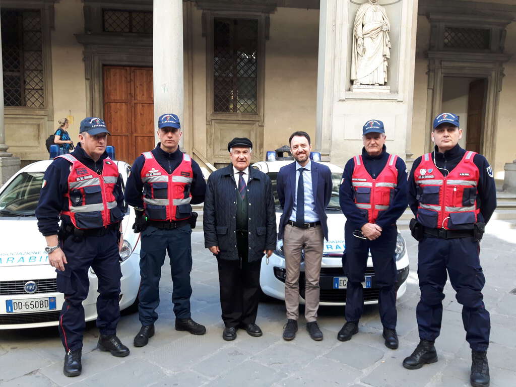 In allego l'assessore Gianassi con i volontari dell'Associazione nazionale Carabinieri agli Uffizi e il colonnello in pensione Salvatore Scafuri. E i volontari in servizio in via Ricasoli