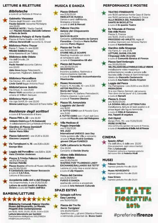 La Prima Notte d’Estate, curata da Alba Donata, presidente del Gabinetto Vieusseux, si concentrerà sulla lettura: le biblioteche saranno aperte fino a tarda ora e attori e scrittori leggeranno brani scelti da autori, da Calvino a Tolstoj, da Orwell a Kafka. Non mancherà la musica: tra gi appuntamento ‘Bach in black’ a Palazzo vecchio (Salone dei Cinquecento ore 21), e il tango al museo del Novecento. Spazio anche al teatro (per esempio con lo spettacolo ‘Alla scoperta del paradiso di Dante in bicicletta’ e con le ‘Migrazioni’ alla Loggia del Pesce) e il cinema, con la proiezione no stop del film L’Universale allo spazio Alfieri. Aperti anche il museo di Palazzo Vecchio e museo Novecento e Casa Siviero, gratuiti dalle 19. Non mancheranno attività per bambini a cura dell’associazione Muse (info@muse.comune.fi.it). Anche molte librerie saranno aperte con varie attività fino a mezzanotte. (edl)