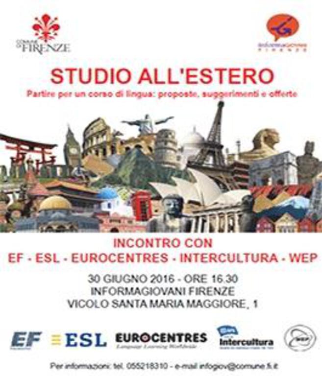 Vorresti trascorrere un periodo di studio all’estero per imparare una nuova lingua, vivere una cultura diversa e fare nuove amicizie? Giovedì 30 giugno, il servizio InformaGiovani del Comune di Firenze organizza l’incontro “Studio all’estero” consigli e proposte per imparare una lingua all’estero. Partecipano cinque organizzazioni annoverate come leader mondiali nel settore EF – Education First, ESL, Eurocentres, Intercultura Onlus e WEP.