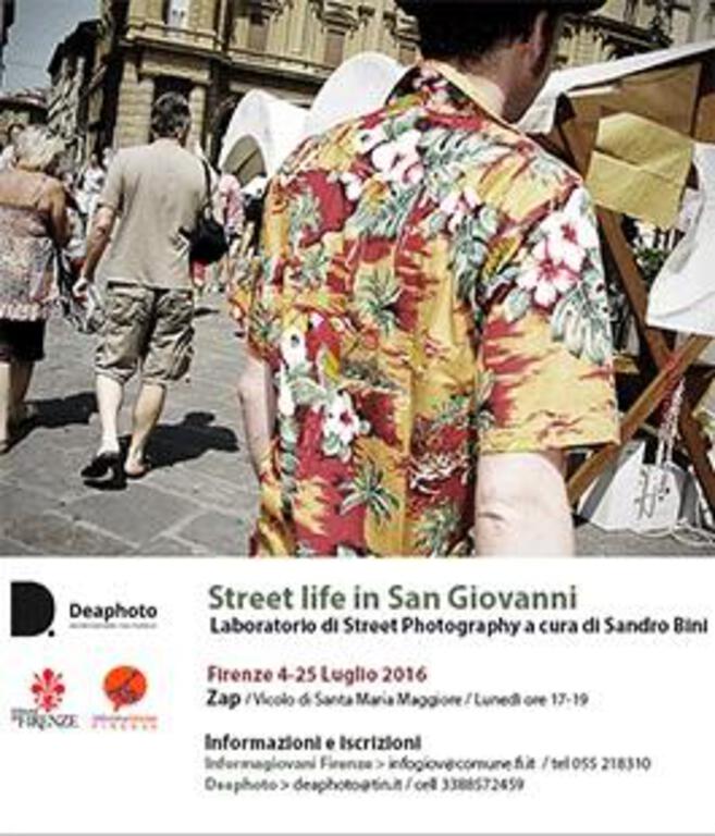 L’Associazione Culturale Deaphoto in collaborazione con Informagiovani Firenze propone presso Zap Zona Aromatica Protetta, Vicolo di Santa Maria Maggiore, 1 Firenze il Laboratorio di Street Photography “Street Life In San Giovanni” (8 ore 80 Euro), 4 incontri a Luglio (il lunedì ore 17-19) durante i quali verranno illustrate le tecniche narrative e descrittive del reportage urbano. Il laboratorio sarà finalizzato alla realizzazione di un lavoro collettivo sul Quartiere di San Giovanni nel Centro Storico di Firenze. La ”Street Photography un tipo di fotografia di tendenza umanistica, prevalentemente urbana, che ha come interesse principale e l’uomo e le situazioni umane e come campo di azione la strada, intesa come luogo di osservazione privilegiato della realtà sociale, contenitore visivo di storie, vicende, destini, segni, tracce.