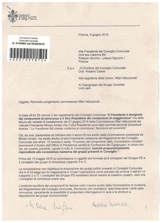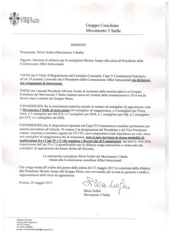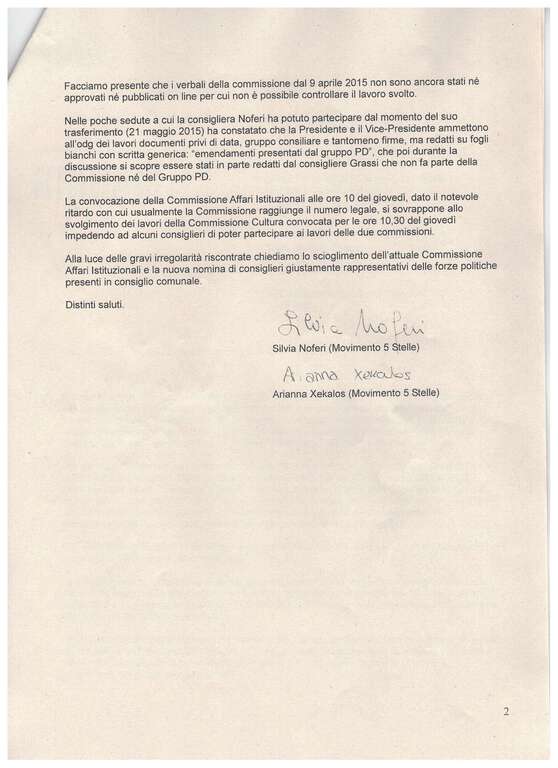 Alleghiamo copia dei documenti citati (mozione di sfiducia e richiesta scioglimento della Commissione)”. (fdr)