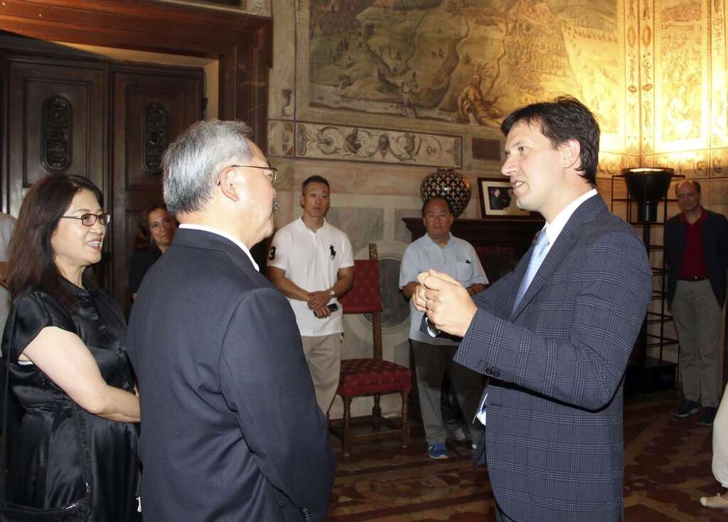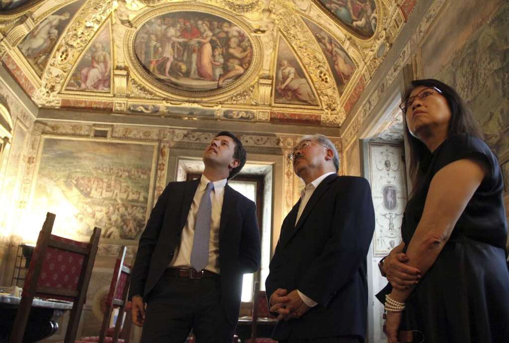 Dopo una breve visita nel Salone dei Cinquecento e nel museo di Palazzo Vecchio, la firma nel ‘Libro d’onore’ e lo scambio di doni nella Sala di Clemente VII. A Lee il sindaco Nardella ha regato la ‘Sigillo della Pace’ (il Sigillo venne adottato nel XV secolo dalle più alte cariche della Repubblica fiorentina ed ha la scritta «S. Pax et Defensio Libertatis») e una riproduzione di una tavola geografica della California del XVI secolo, il cui originale è conservato proprio a Palazzo Vecchio, nella Sala delle Carte geografiche. A Nardella il sindaco Lee ha donato una penna in legno pregiato.