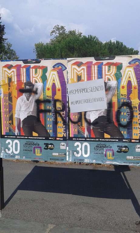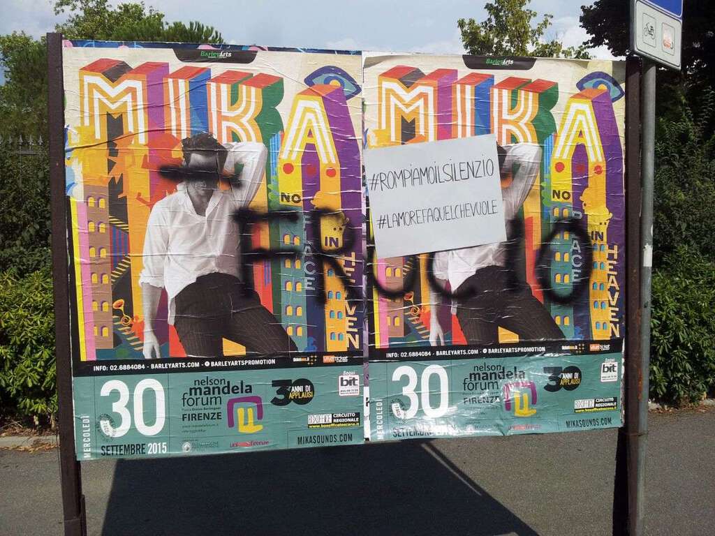 Il sindaco Dario Nardella ha ordinato di rimuovere il manifesto pubblicitario che annunciava il concerto del cantante Mika a settembre al Mandela Forum, imbrattato da ignoti con scritte omofobe.