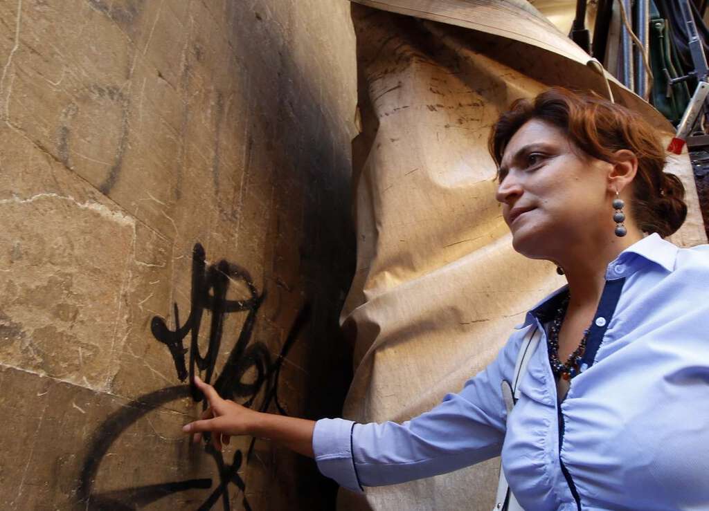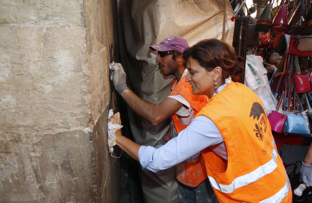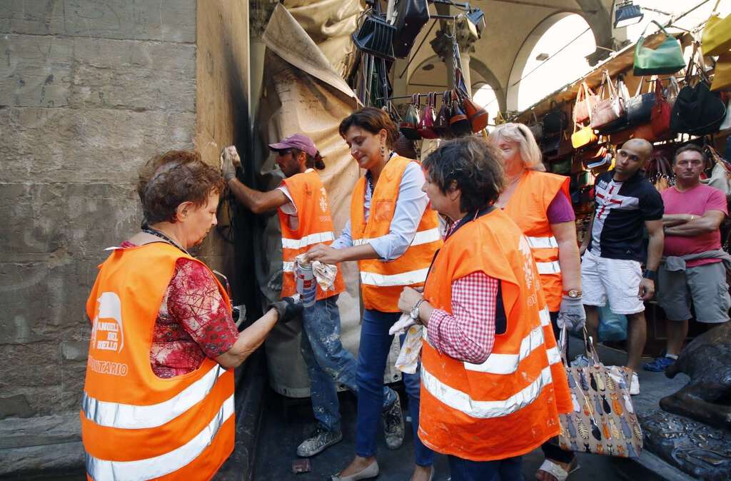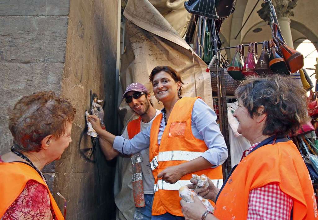 Graffiti cancellati alla Loggia del Porcellino. Ad intervenire, questo pomeriggio, una squadra di volontari degli Angeli del Bello insieme all’assessore al decoro Alessia Bettini.