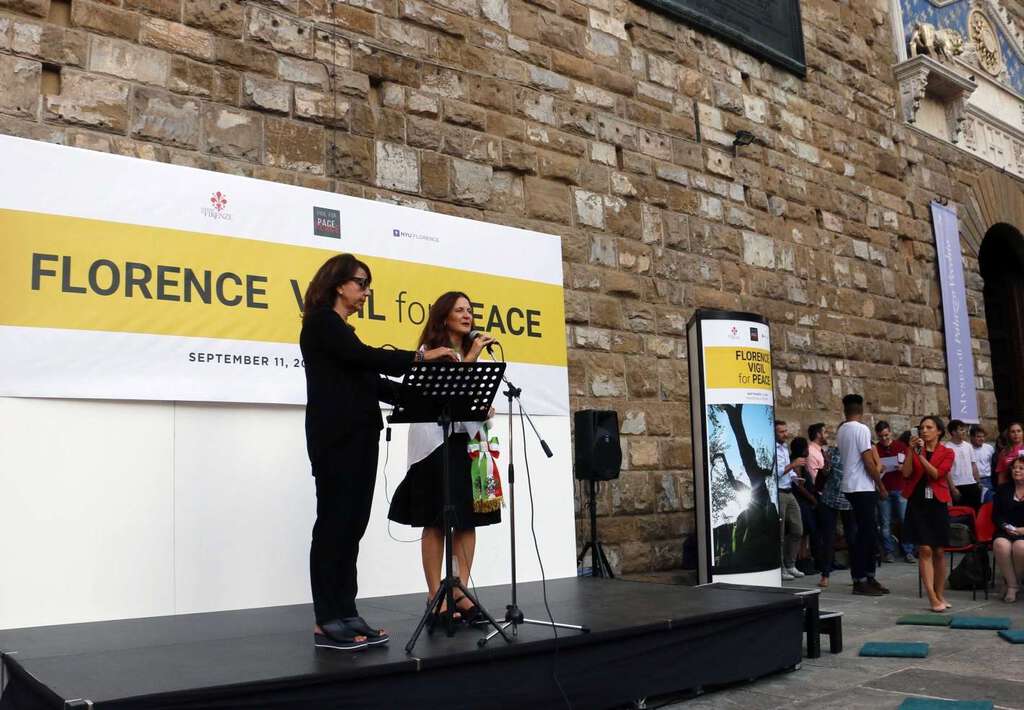 A partire dalle 18, sull’Arengario di Palazzo Vecchio, sono stati letti testi di prosa o poesie (alcuni dei quali pubblicati sulla pagina web dedicata all’evento: https://wp.nyu.edu/vigilforpeace/).