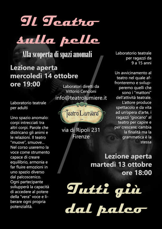 Presenti anche quest’anno i corsi di teatro tenuti da Vittorio Cencioni, il corso per ragazzi Tutti giù dal palco, e il corso per adulti Il teatro sulla pelle – alla scoperta di spazi anomali. (s.spa.)