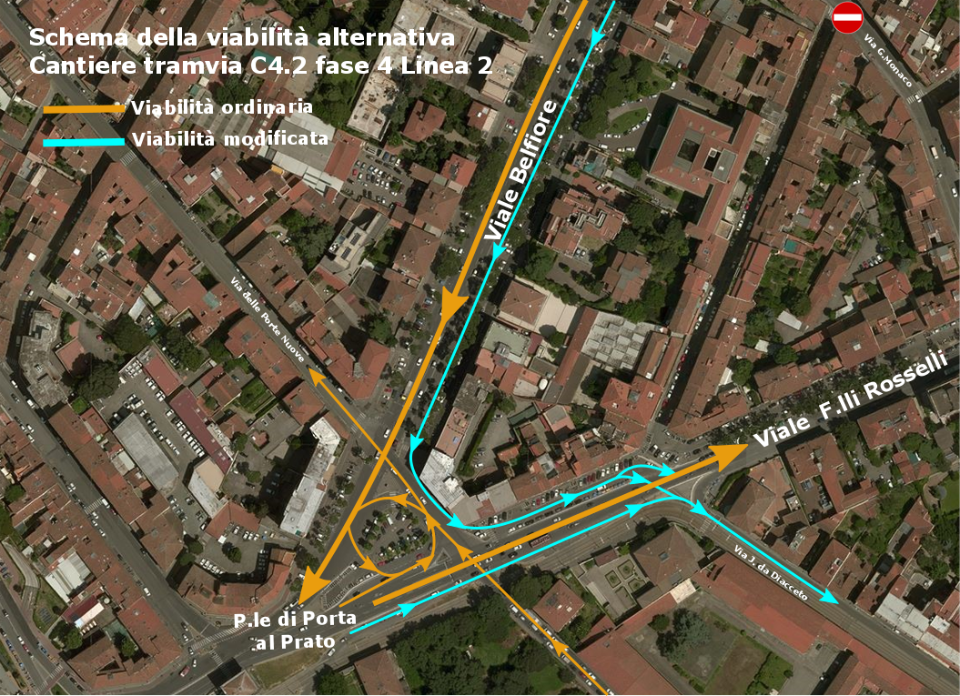 In concreto per i veicoli provenienti da viale Redi e diretti verso Ponte alla Vittoria non cambierà niente: potranno continuare ad utilizzare viale Belfiore (sul lato sinistro del cantiere). Quelli che invece vogliono raggiungere viale Fratelli Rosselli, una volta arrivati in viale Belfiore dovranno posizionarsi sulle corsie a sinistra del viale per poi svoltare a destra all’altezza dell’edificio d’angolo tra viale Belfiore e viale Fratelli Rosselli ed entrare sul controviale di viale Fratelli Rosselli (saranno realizzate due corsie protette). A questo punto i veicoli diretti in viale Strozzi potranno rientrare sul viale mentre quelli diretti alla stazione di Santa Maria Novella imboccheranno via Jacopo Da Diacceto (che per l’occasione cambierà senso di marcia) attraversando la carreggiata del viale Fratelli Rosselli grazie ad un nuovo impianto semaforico. I veicoli provenienti da viale Belfiore potranno rientrare in viale Fratelli Rosselli anche grazie alla svolta che sarà istituita all’interno dell’attuale isola spartitraffico adiacente alla porta monumentale. La cantierizzazione in corrispondenza dell’intersezione tra viale Belfiore-viale Redi-via Benedetto Marcello comporterà la specializzazione delle carreggiate del sottopasso tra Strozzi e Belfiore. I veicoli diretti a Porta a Prato-Ponte alla Vittoria dovranno obbligatoriamente utilizzare la canna lato Fortezza; sarà invece possibile per i mezzi in transito nella canna lato viale Redi di rientrare sulla direttrice verso Porta a Prato. Inoltre nel corso dei lavori sarà chiuso l’accesso a via Cassia per i veicoli provenienti dal sottopasso. Passando a viale Fratelli Rosselli, alle modifiche alla viabilità per consentire l’accesso in via Jacopo Da Diacceto si aggiungerà lo spostamento dell’attraversamento pedonale sull’altro lato di via della Scala in modo da consentire la svolta a destra dei veicoli provenienti da quest’ultima strada.