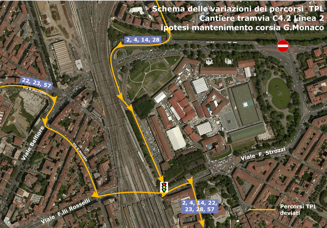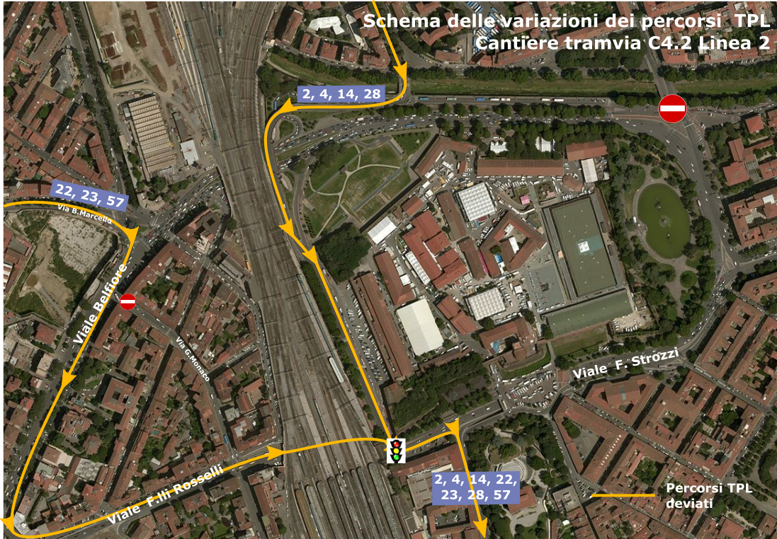 Per le linee provenienti da via Benedetto Marcello (23, 22 e 57) è allo studio l’ipotesi, la cui compatibilità con la cantierizzazione è ancora da verificare, di mantenere una corsia ad uso soltanto dei mezzi pubblici in via Guido Monaco per poi immettersi in viale Rosselli e continuare su viale Strozzi/via Valfonda. In caso contrario, i bus proseguiranno su viale Belfiore per poi svoltare a Porta a Prato rientrando così in viale Fratelli Rosselli. Da qui proseguiranno in viale Strozzi per poi raggiungere la stazione da via Valfonda. È comunque in corso di approfondimento da parte degli uffici della mobilità e di Ataf una ulteriore soluzione per le linee del Tpl urbano provenienti da via Benedetto Marcello: ovvero la deviazione dei bus da piazza San Jacopino in via Pier Luigi Da Palestrina (che in questa ipotesi diventerebbe corsia preferenziale) e poi in via Ponte alle Mosse. Da qui gli autobus rientreranno in viale Fratelli Rosselli e arriveranno alla stazione da via Valfonda.