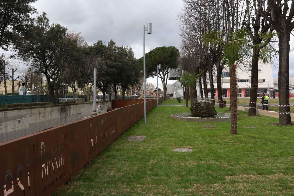 La recinzione in lamiera forata che corre lungo il Macinante contiene i nomi dei grandi compositori fiorentini del Novecento (da Dalla Piccola a Berio) selezionati con l’apporto della Fondazione Maggio Musicale.