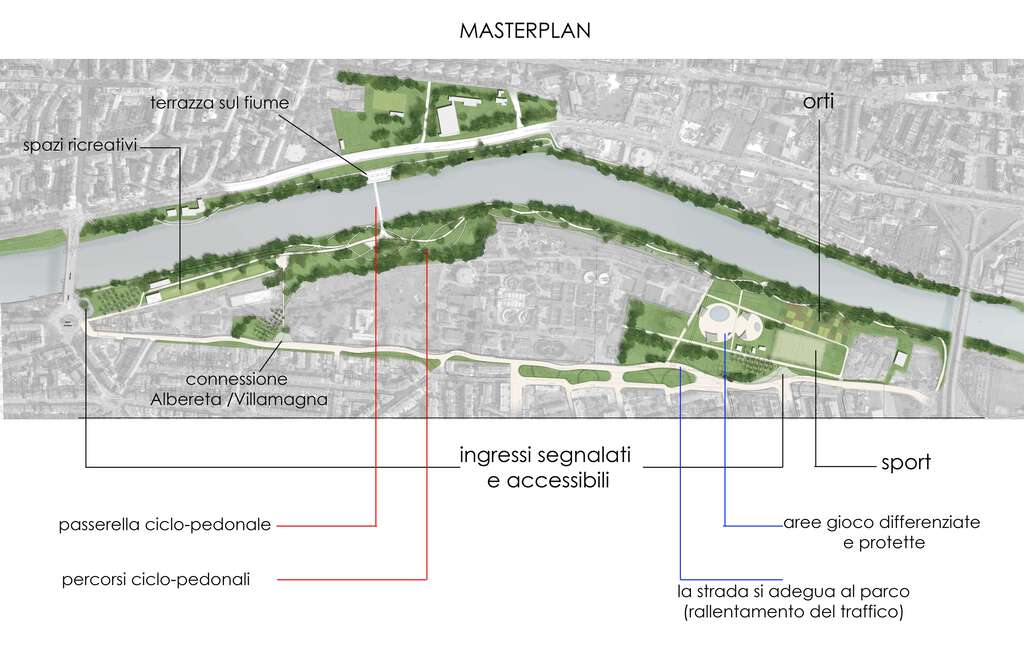 La connessione tra le tre aree verdi e la riscoperta di un rapporto più intimo con il fiume sono le due parole d'ordine del progetto. Altro obiettivo la ricostruzione di un parco “anti-maltempo”, in grado di resistere anche agli eventi climatici di particolare importanza. In tal caso, giocano un ruolo determinante i nuovi impianti. Su questo fronte, il masterplan cerca di rispettare le caratteristiche “storiche” dei diversi luoghi, prediligendo l'aspetto naturalistico dell'Albereta e la funzione di giardino dell'Anconella. Per quanto riguarda la prima, l'effetto della vecchia pioppeta viene riproposto attraverso l'impiego di frassini, querce di specie diverse, lecci e tigli. I lecci sostituiscono efficacemente anche la funzione dei pini, mantengono la chioma verde anche d’inverno, ma resistono meglio alle tempeste di vento per il loro apparato radicale meglio ancorato al suolo e per lo sviluppo della chioma più contenuto.