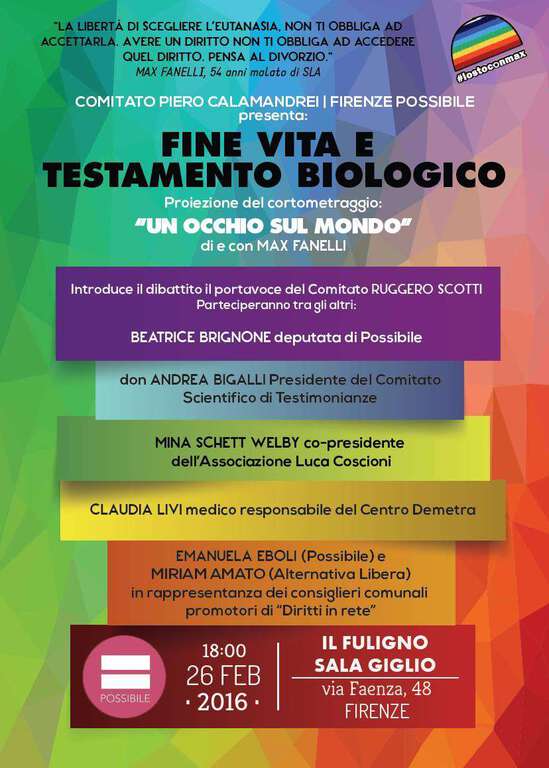 “Ne parleremo – spiega la consigliera Miriam Amato – insieme a Mina Schett Welby dell’Associazione Luca Coscioni, a Claudia Livi, medico responsabile del centro Demetra, a Don Andrea Bigalli, presidente del comitato scientifico di “Testimonianze”, alla deputata Beatrice Brignone e alla consigliera comunale di Campi Bisenzio Emanuela Eboli (Possibile)Da anni si lotta per ottenere la calendarizzazione della legge sul testamento biologico, rispondendo all’appello, fra gli altri, di Max Fanelli, del quale verràproiettato il documentario “Un occhio sul mondo”. Il video racconta la vicenda dolorosa della sua malattia, con cui sta chiedendo di avere il diritto di scegliere alla luce del sole il momento in cui staccare la spina, quando non rimane nient'altro che la sofferenza” spiegano i promotori.