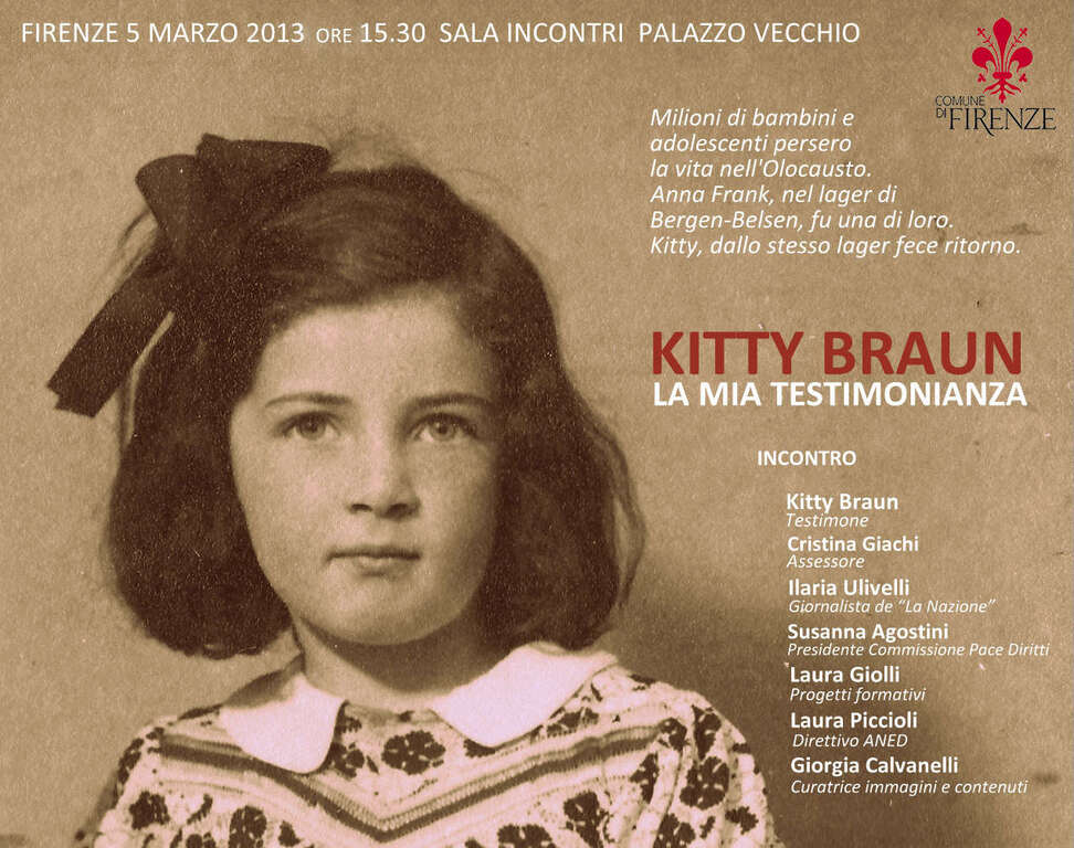 Un incontro con una donna straordinaria, sopravvissuta al campo di Bergen-Belsen, profuga giuliana efiorentina d’adozione dal ‘47: si chiama Kitty Braun e ad ascoltare e discutere la sua toccante testimonianza, martedì 5 marzo alle 15.30 nella Sala Incontri di Palazzo Vecchio, ci saranno tra gli altri l’assessore Cristina Giachi, la presidente della Commissione pace Susanna Agostini, la giornalista della Nazione Iliaria Ulivelli, Laura Piccioli del direttivo Aned, la responsabile dei progetti educativi del Comune Laura Giolli e la fotografa Giorgia Calvanelli, curatrice delle immagini e dei contenuti dell’iniziativa. Un appuntamento che declina al meglio la prossima Festa della Donna raccontando l’esperienza di vita di Kitty, nata a Fiume nel 1936, catturata dai tedeschi con tutta la sua famiglia l'11 novembre 1944, deportata prima a Ravensbruck e poi a Bergen-Belsen, liberata dall’esercito britannico il 15 aprile 1945 (ma il fratellino Robi non sopravviverà) e profuga istriana dopo il Trattato di Parigi del 1947, quando l’Italia cede Fiume alla Jugoslavia e i Braun decidono di trasferirsi a Firenze. Da allora Kitty vive nella nostra città, dove è stata insegnante di latino e greco, anche al liceo Galileo.