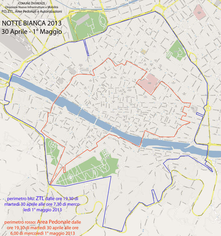 La maggior parte dei provvedimenti prenderà il via alle 19.30, ad iniziare dal proseguimento della ztl anche in orario serale e notturno (fino alle 7.30 di mercoledì 1 maggio con accensione delle porte telematiche) nell’area normalmente regolata da questa disciplina ampliata per l’occasione a sud-est nella zona di San Niccolò, ovvero l’area compresa fra via San Leonardo (inclusa), viale Galilei (escluso), via dell’Erta Canina (tratto senza sfondo con accesso e uscita da viale Galilei – esclusa), viale Galilei (escluso), viale Poggi (escluso), via dei Bastioni (tratto viale Poggi-via Ser Ventura Monachi – esclusa), via Ser Ventura Monachi (tratto via dei Bastioni-piazza Ferrucci – esclusa), piazza Ferrucci (esclusa). Rientrano nel provvedimento anche piazza Piave (corsia di collegamento con lungarno della Zecca Vecchia), lungarno della Zecca Vecchia, piazza Cavalleggeri e lungarno delle Grazie.