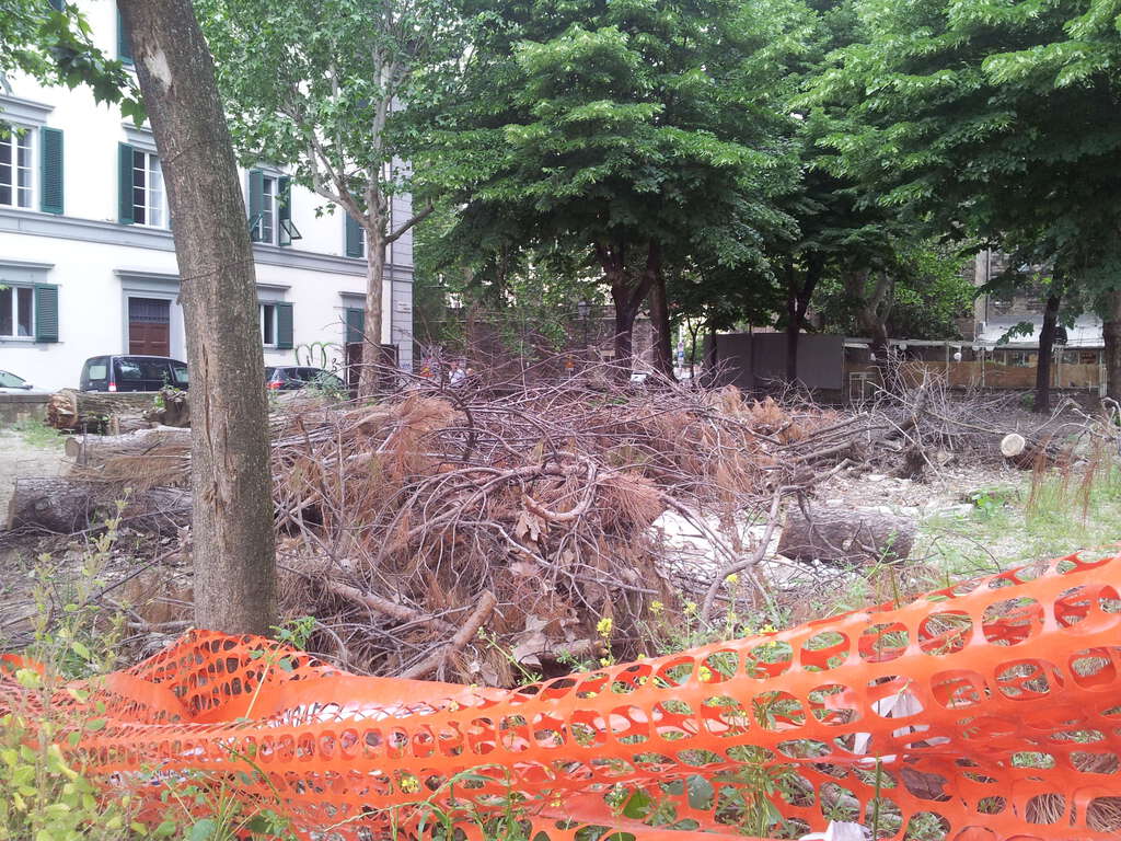 Di fatto sono stati solo rimossi i residui della copertura mentre i tronchi tagliati e la vegetazione - ormai secca e raccolta in diversi cumuli - fanno brutta mostra di sé per chiunque si trovi a passare sul Lungarno o sul vicino Ponte Vespucci.
