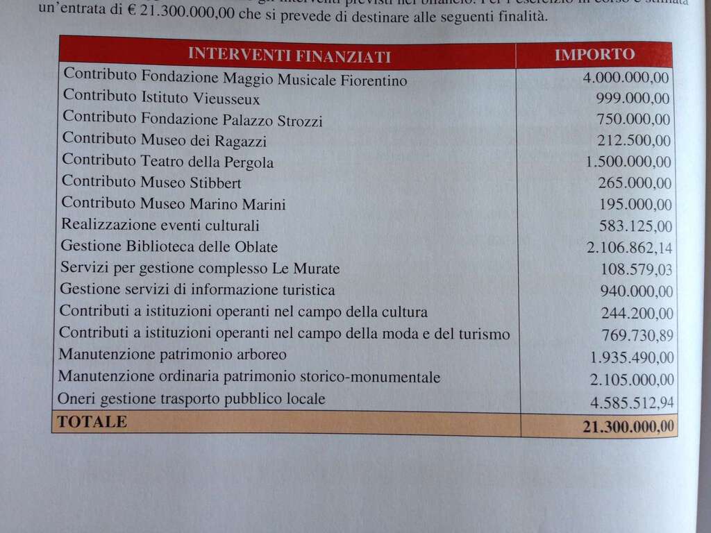 “Viene dato a Firenze l’ennesimo bilancio di chiacchiere che non sarà supportato dai fatti. Basta partire dall’ultima “sparata” di Renzi per dimostrarlo. A giugno il sindaco ha detto che il suo piano è quello di far gestire ad un unico soggetto culturale i 21 milioni che Firenze incassa con l’imposta di soggiorno. Ma nel bilancio di Luglio cosa mette? La stessa ripartizione dello scorso anno che spezzetta i proventi fra vari istituti e fondazioni, la manutenzione degli alberi e la gestione del trasporto pubblico (vedi Foto1). A settembre cosa farà? Ha intenzione di dare corso alle sue idee con una variazione di bilancio? Impossibile: con quelle cifre già messe nei conti il cambio è pura chimera, perché non si darebbe copertura da solo. Quindi le sue fantasie le realizzerà altrove, a meno che non si inventi il “Carrozzone dei Carrozzoni” di cui non se ne sente proprio il bisogno.