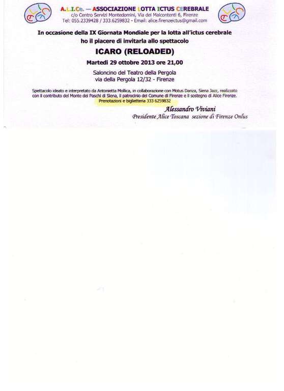 Quest’anno la battaglia contro l’Ictus la si combatte anche a teatro. Infatti il 29 ottobre, in occasione della 9° Giornata mondiale contro l’ictus celebrale, nel Saloncino del Teatro della Pergola di Firenze sarà presentato “ICARO, Reloaded”. Si tratta di un evento teatrale ideato e condotto da Antonietta Mollica, realizzato da Teatro Danza, coprodotto da MOTUS, che racconta la storia della protagonista, dall’ictus alla rinnovata indipendenza.