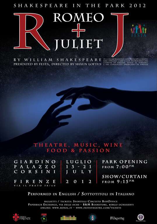 L’intero cartellone delle attività estive di F.E.S.T.A. (Florence English Speaking Theatrical Artists) si è quest’anno spostato all’interno del Giardino Monumentale di Palazzo Corsini (in via il Prato 58), per mettervi in scena il più famoso tra i drammi di Shakespeare: Romeo and Juliet (in lingua originale con sottotitoli).
