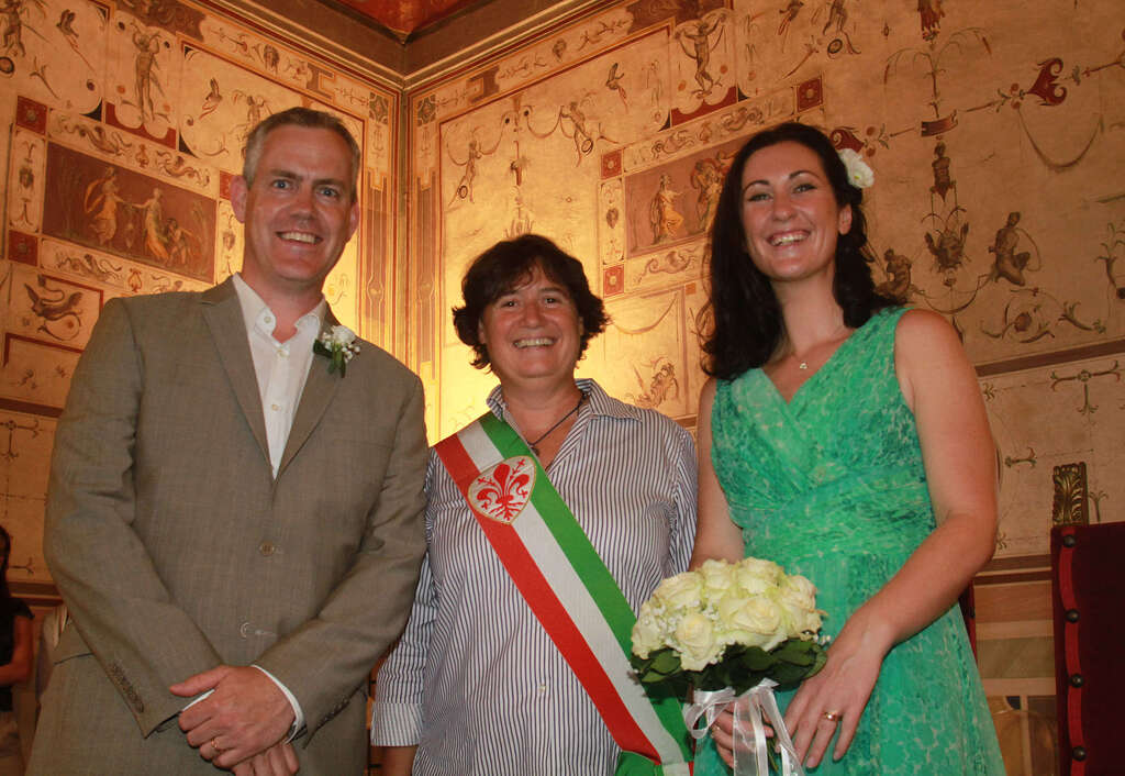 Lo sposo si chiama Brynley Rhys Buffery, origini inglesi; lei è Corina Antonia Moloney, iralandese. Il rito è stato celebrato dall’assessore Saccardi in italiano e tradotto per gli sposi in inglese dalla 'wedding planner' Bonnie Marie Bates. Ma alla fatidica domanda gli sposi non hanno potuto fare a meno di rispondere ‘sì’ in italiano.