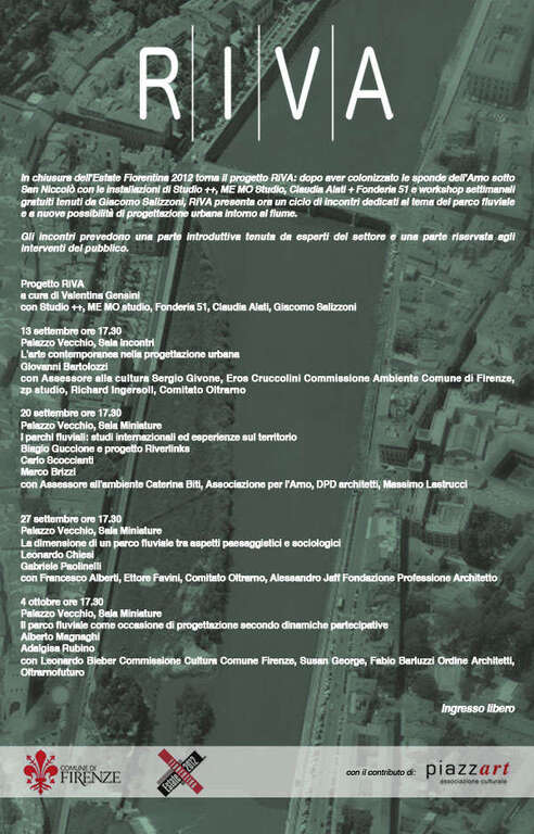 Quattro incontri a ingresso libero (il primo domani, 13 settembre) per discutere sul futuro ambientale, urbanistico e architettonico ma anche sociale e culturale dell’Arno. E’ questa la conclusione del progetto RIVA, iniziativa a cura di Valentina Gensini partita a inizio estate proprio dalla sponda sinistra del fiume, sotto piazza Poggi.