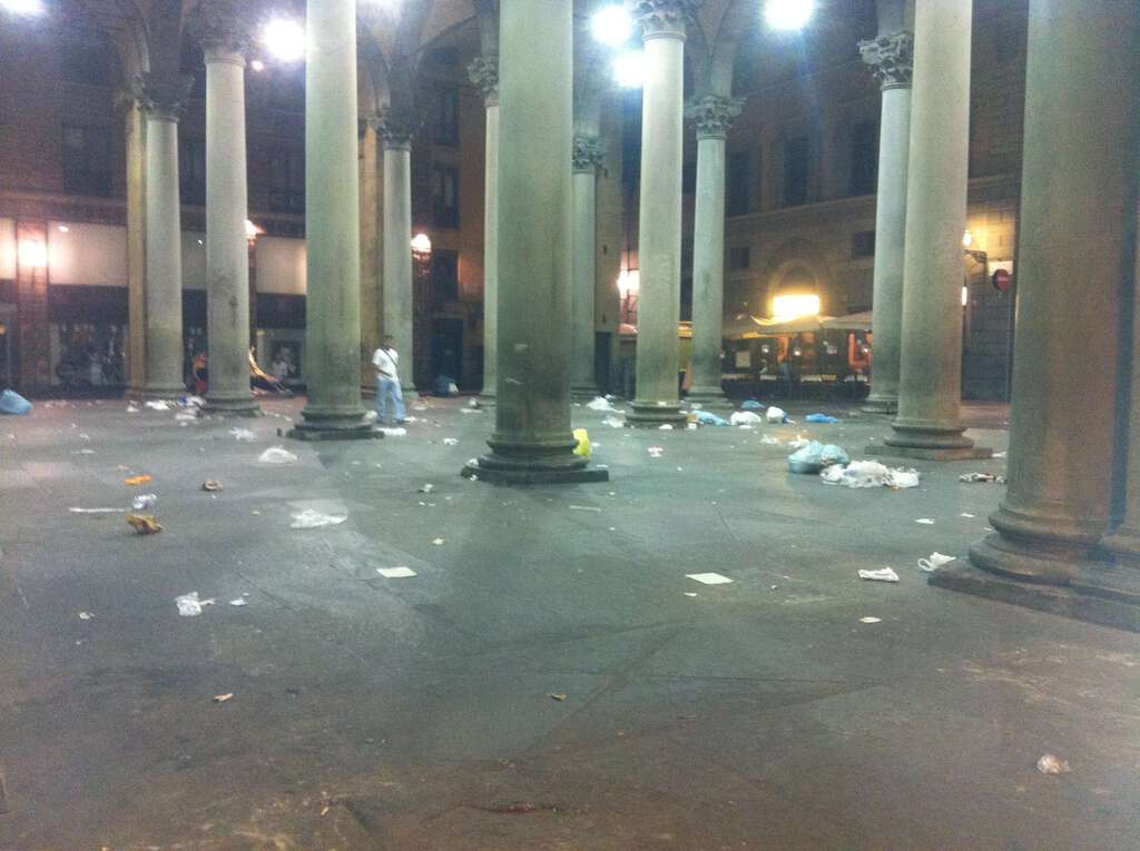 “La foto allegata mostra come si presentava la Loggia del Porcellino un paio di sere fa alle 22 e 45. Un bel biglietto da visita per i turisti, e una grande tristezza per noi fiorentini. Questo è d'altra parte il centro come l’ha voluto la nostra Amministrazione, perché basta andare nelle piazze più belle per vedere lo stesso scempio. Caro Matteo, sii obiettivo, durante il tuo tour per le province italiane, fai vedere foto come questa e racconta che contro il degrado poco o nulla hai fatto nella città dove sei sindaco da 3 anni”.