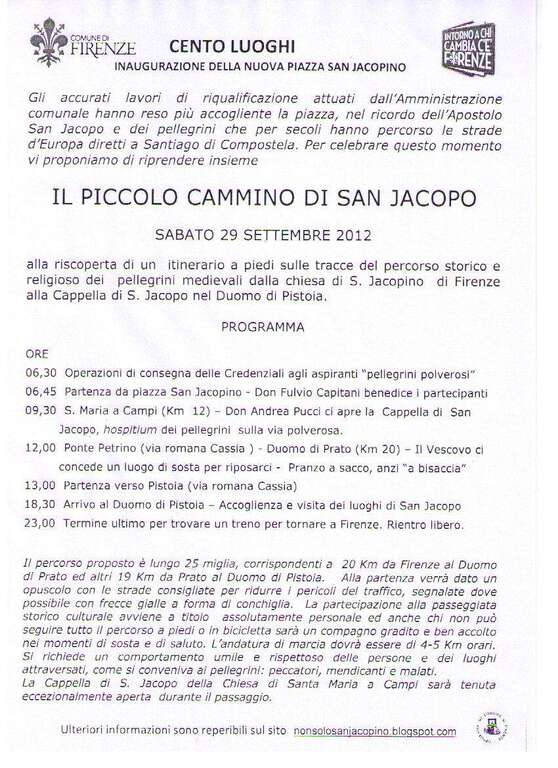 Sulla scia degli eventi che sono emersi nel corso della ricerca, è venuta l’idea di riproporre il cammino da Firenze a Pistoia seguendo le tracce dei pellegrini medievali e toccando le tante chiese intitolate a San Jacopo scoperte lungo il tragitto, molte delle quali dotate di ospizio per i viandanti. Dopo un anno di lavoro, sabato 29 settembre quella idea diventa realtà. Da San Jacopino partirà infatti un gruppo di novelli pellegrini alla volta di Pistoia lungo un percorso di 25 miglia, ovvero 39 chilometri (20 da Firenze al Duomo di Prato e altri 19 da Prato al Duomo di Pistoia). Ai partecipanti al momento della partenza (fissata alle 6.45 e preceduta dalla consegna delle credenziali agli aspiranti “pellegrini polverosi”) verrà dato un opuscolo con le strade consigliate per ridurre i pericoli del traffico, segnalate dove possibile con frecce gialle a forma di conchiglia. Lungo il percorso, tracciato da Antonio Caminati accompagnatore di Trekking Italia, i novelli pellegrini potranno sostare presso la Cappella di San Jacopo a Santa Maria a Campi (aperta eccezionalmente per l’occasione), al Duomo di Prato e al Duomo di Pistoia.