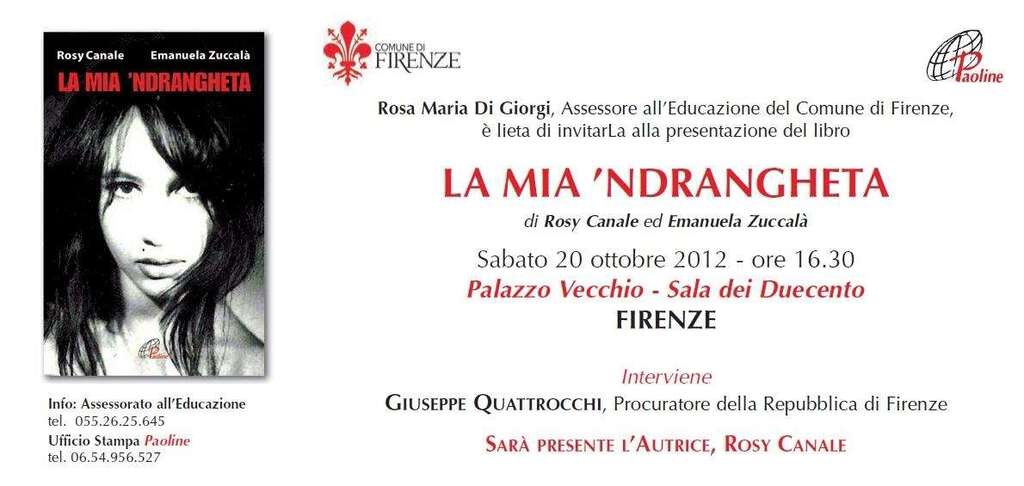 Domani nel Salone dei Duecento presentazione del libro La mia ndrangheta' di Rosy Canale