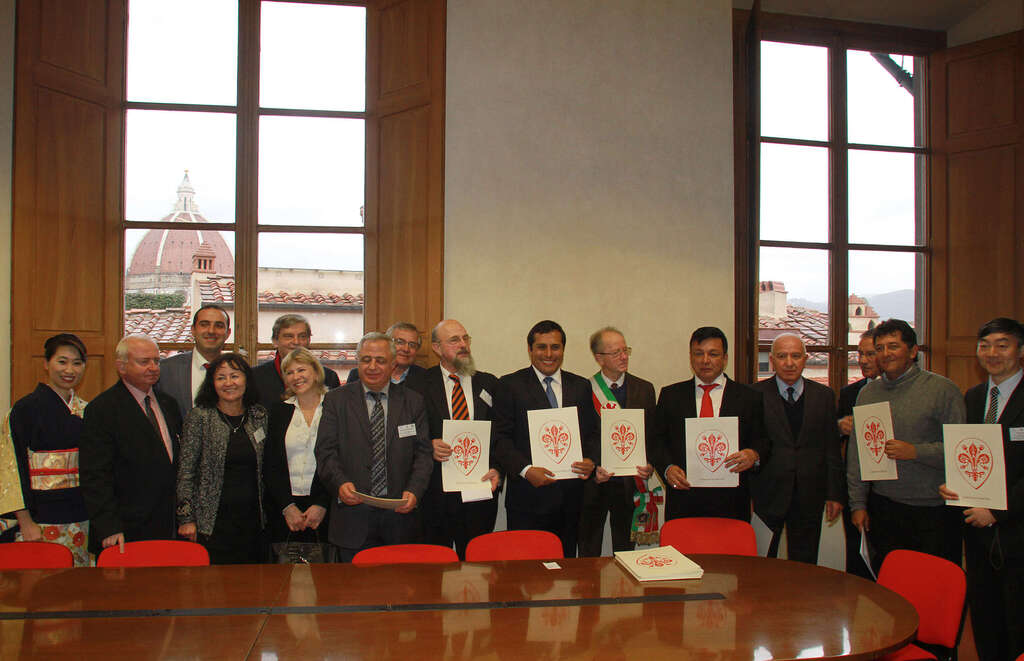 Questo pomeriggio nella Sala della Miniatura di Palazzo Vecchio l’assessore alla cultura Sergio Givone, insieme a Paolo Del Bianco, presidente della Fondazione Romualdo Del Bianco-Life Beyond Tourism, ha incontrato le delegazioni straniere provenienti da Baku, Callao, Cracovia, Ibaguè, Kyoto, Lima, Mosca, Mostar, Sarajevo, Pechino, Tomsk, Wroclaw e Yerevan, ospiti della Fondazione, che per oggi ha organizzato la quarta edizione della Festa degli Auguri delle Terre. L’iniziativa, collegata alle mostre de “La città degli Uffizi” promosse a partire dal 2008 dalla Galleria degli Uffizi e alla cui realizzazione ha dato il suo sostegno la Fondazione, è anche l’occasione per la presentazione da parte di Paolo Del Bianco del nuovo portale Community Life Beyond Tourism (web 2.0).