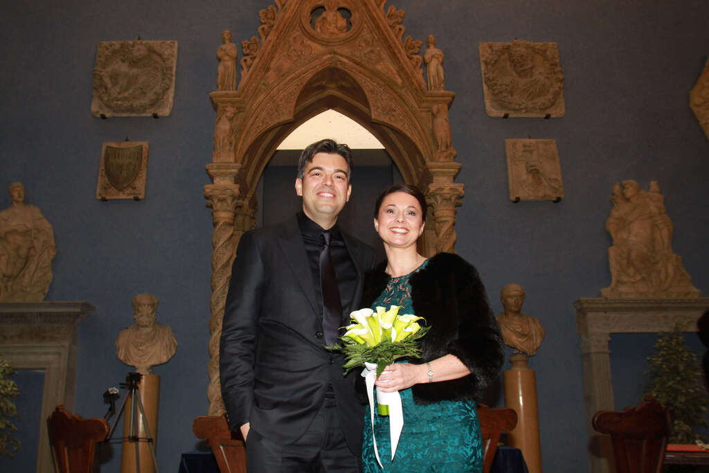 È stato celebrato questo pomeriggio il primo matrimonio civile al museo Bardini: il sì è stato pronunciato da Paolo Vivarelli e Ilaria Serafini, che per l’occasione ha indossato unabito verde di pizzo di Dolce & Gabbana, a cui era stato abbinato un elegante bouquet composto da calle bianche. L’arte e i fiori (rose bianche, piccole orchidee bianche e delle stelle di Natale sempre di colore bianco) hanno fatto da cornice alla cerimonia nuziale di Paolo e Ilaria, che hanno deciso di convolare a giuste nozze dopo tre anni di fidanzamento e una lunga conoscenza nata sui banchi del liceo classico Machiavelli.