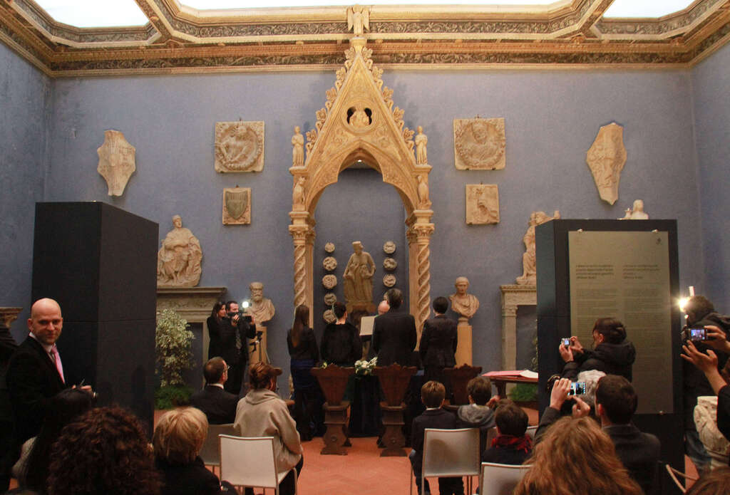 Le nozze dei due giovani fiorentini, celebrate in una delle nuove location scelte dall’amministrazione comunale in aggiunta alla tradizionale Sala Rossa di Palazzo Vecchio insieme al Salone dei Cinquecento, al Giardino delle Rose e alla Sala di Lorenzo, sono state celebrate nella Sala della Carità del Museo da Andrea Parrini, amico degli sposi.