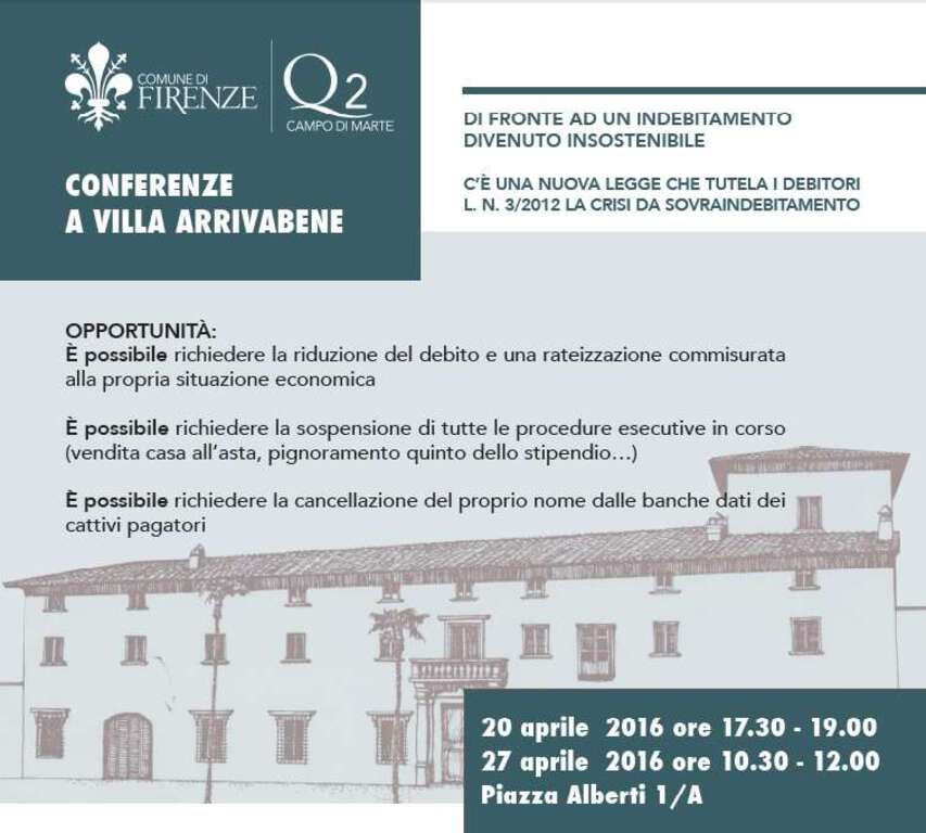 Di fronte ad un indebitamento divenuto insostenibile c’è una nuova legge che tutela i debitori. La crisi da sovra indebitamento – legge n. 3/2012. Un ciclo di conferenze a Villa Arrivabene, sede del quartiere 2 (piazza Alberti, 1/A) domani, mercoledì 20 aprile dalle 17,30 alle 19 e mercoledì 27 aprile dalle 10,30 alle 12. Due incontri per informare sull’opportunità di richiedere la riduzione del debito e una rateizzazione commisurata alla propria situazione economica; sulla possibilità di richiedere la sospensione di tutte le procedure esecutive in corso (vendita casa all’asta, pignoramento quinto dello stipendio…); sulla possibilità di richiedere la cancellazione del proprio nome dalle banche dati dei cattivi pagatori. Gli incontri sono rivolti alle persone fisiche; agli imprenditori agricoli; agli imprenditori commerciali non fallibili; agli enti privati non commerciali; ai lavoratori autonomi, associazioni tra professionisti; alle start up innovative. (s.spa.)