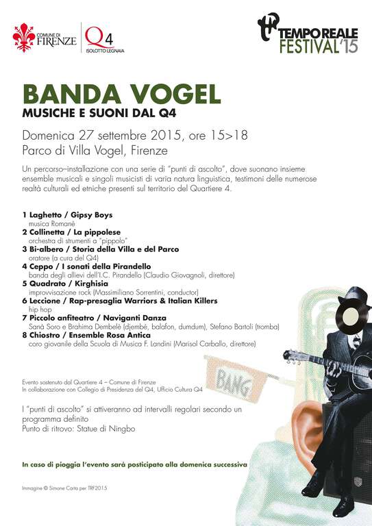 Domenica 27 settembre, dalle ore 15 alle ore 18, si terrà Banda Vogel un percorso-installazione con una serie di “punti di ascolto” dove suoneranno insieme ensemble musicali e singoli musicisti di varia natura linguistica, testimoni delle numerose realtà culturali ed etniche presenti sul territorio del Quartiere 4. L’iniziativa, nell’ambito del Festival di Tempo Reale, si terrà nel parco di Villa Vogel.