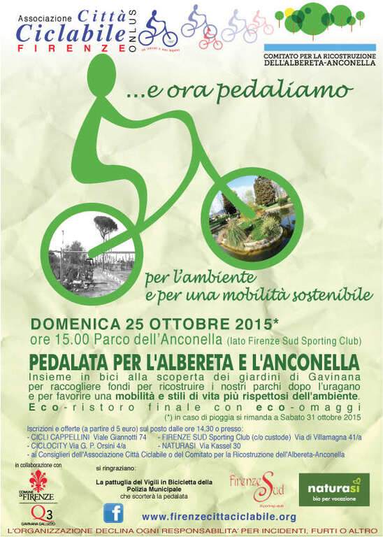 L’associazione Città Ciclabile, in collaborazione col Q3 e il Comitato per la ricostruzione dell’Albereta-Anconella, organizza domenica 25 ottobre una pedalata alla scoperta dei giardini di Gavinana per raccogliere offerte (a partire da 5 euro) per ricostruire i parchi distrutti dall’uragano del 1° Agosto con raduno, alle 14.30, presso lo Sporting Club Firenze Sud e partenza alle 15.