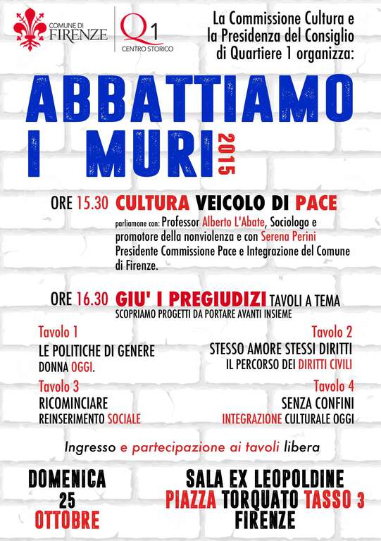 La presidenza del Quartiere 1 e la commissione Cultura del Quartiere 1 organizzano per domenica 25 ottobre un momento di confronto sul concetto di muri, intesi come barriere mentali, culturali e pregiudiziali da abbattere.