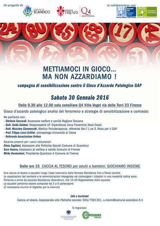 Sabato 30 Gennaio il Quartiere 4, in collaborazione con il Comune di Scandicci, ha organizzato una giornata di sensibilizzazione e contrasto al gioco d’azzardo patologico. La giornata si articolerà in due momenti: un convegno la mattina dalle 9.30 alle 12.00 nella sala Consiliare Tosca Bucarelli di Villa Vogel dove sarà analizzato il fenomeno e le strategie per prevenirlo alla presenza di esperti sul tema e con l’assessore regionale alle politiche socio-sanitarie Stefania Saccardi. “Il gioco d’azzardo patologico è una piaga della nostra società che contribuisce ad aumentare le diseguaglianze colpendo le condizioni di salute e socio-economiche delle singole persone e delle loro famiglie in modo non facilmente recuperabile. È fondamentale partire dal basso con una campagna di sensibilizzazione e la collaborazione delle organizzazioni dei commercianti e altrettanto importante” afferma il presidente del Quartiere 4 Mirko Dormentoni. Continua la presidente della commissione Servizi Sociali del Quartiere Corinna Puggi: “Abbiamo fortemente voluto portare avanti questa iniziativa e siamo felici di farlo insieme al Comune di Scandicci. Siamo da sempre molto sensibili a questa tematica ed abbiamo già da qualche anno un protocollo di intesa per iniziative di sensibilizzazione e contrasto al gioco d’azzardo patologico con il Sert ed il Fondo Essere. Questa giornata sarà solo l’inizio di un percorso di sensibilizzazione alle problematiche che vorremmo portare avanti all’interno delle scuole superiori del nostro territorio”. Conclude la vicepresidente del Quartiere Ilaria Tesi: “Questa iniziativa nasce dalla presa di coscienza di un problema sociale subdolo e diffuso e che negli anni si è particolarmente accentuato. Lo scopo è quello di sensibilizzare i cittadini ed informarli anche sui centri a cui potersi rivolgere. Si tratta di un primo passo di un progetto più ampio che sarà sviluppato sul territorio”.